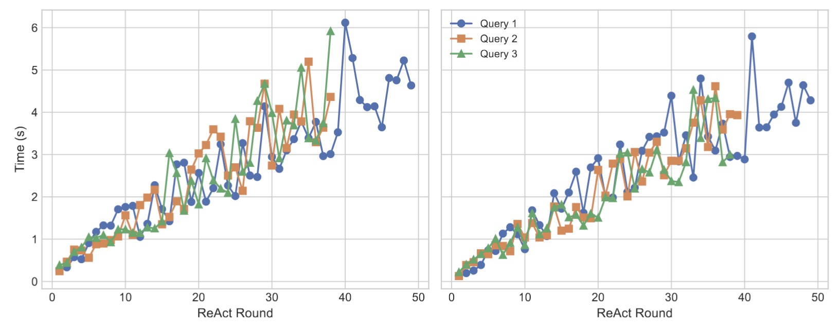In the LlamaIndex framework, we select a subset of queries and visualize how their tool-observation aggregation time and output-parsing time evolve as the number of ReAct iterations increases, as illustrated in Figure 7. Evidently, the context expansion induced by additional ReAct rounds introduces substantial miscellaneous latency into the overall system execution.
