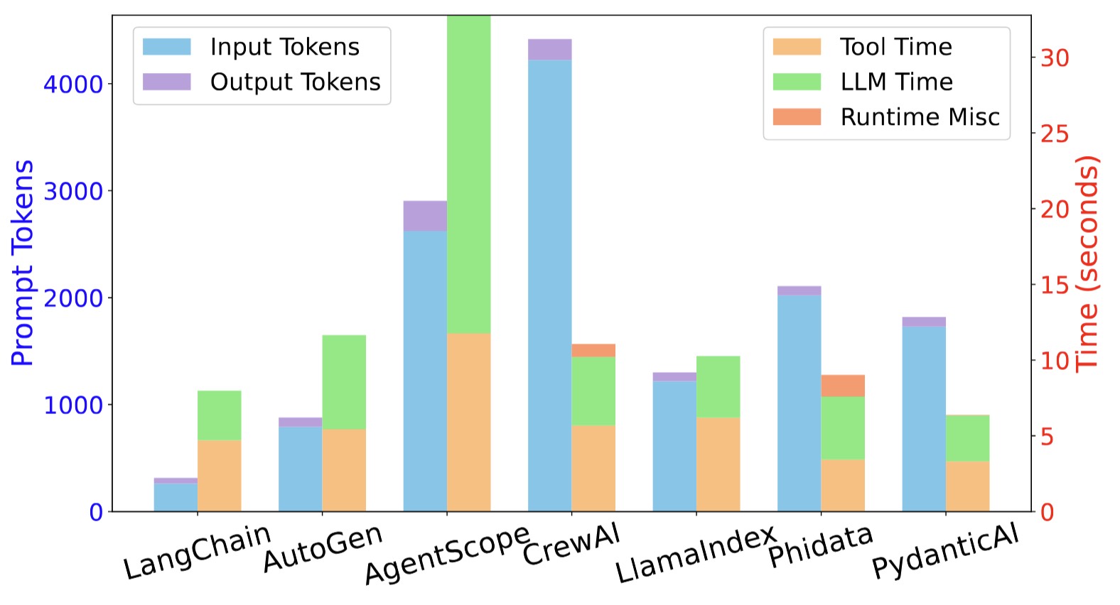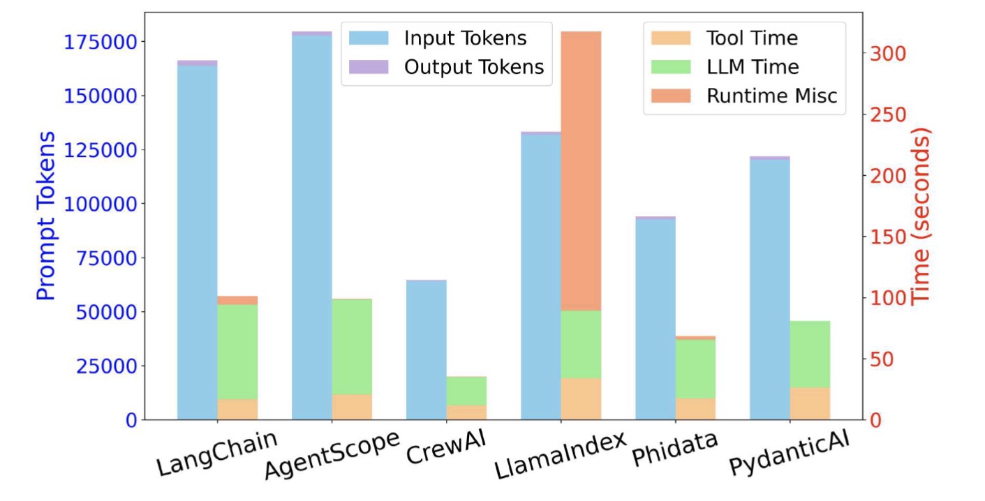 We observe that CrewAI and AgentScope elevate token usage arises from their design choice. In their implementation, the LLM stores all intermediate inputs and outputs in memory and appends this memory to each new prompt. As a result, the prompt length grows with every step of reasoning, causing a high token consumption.