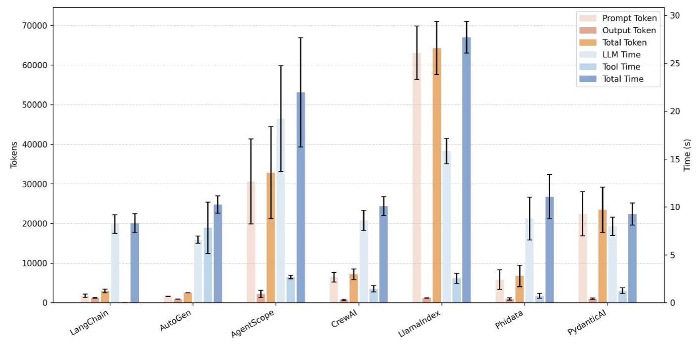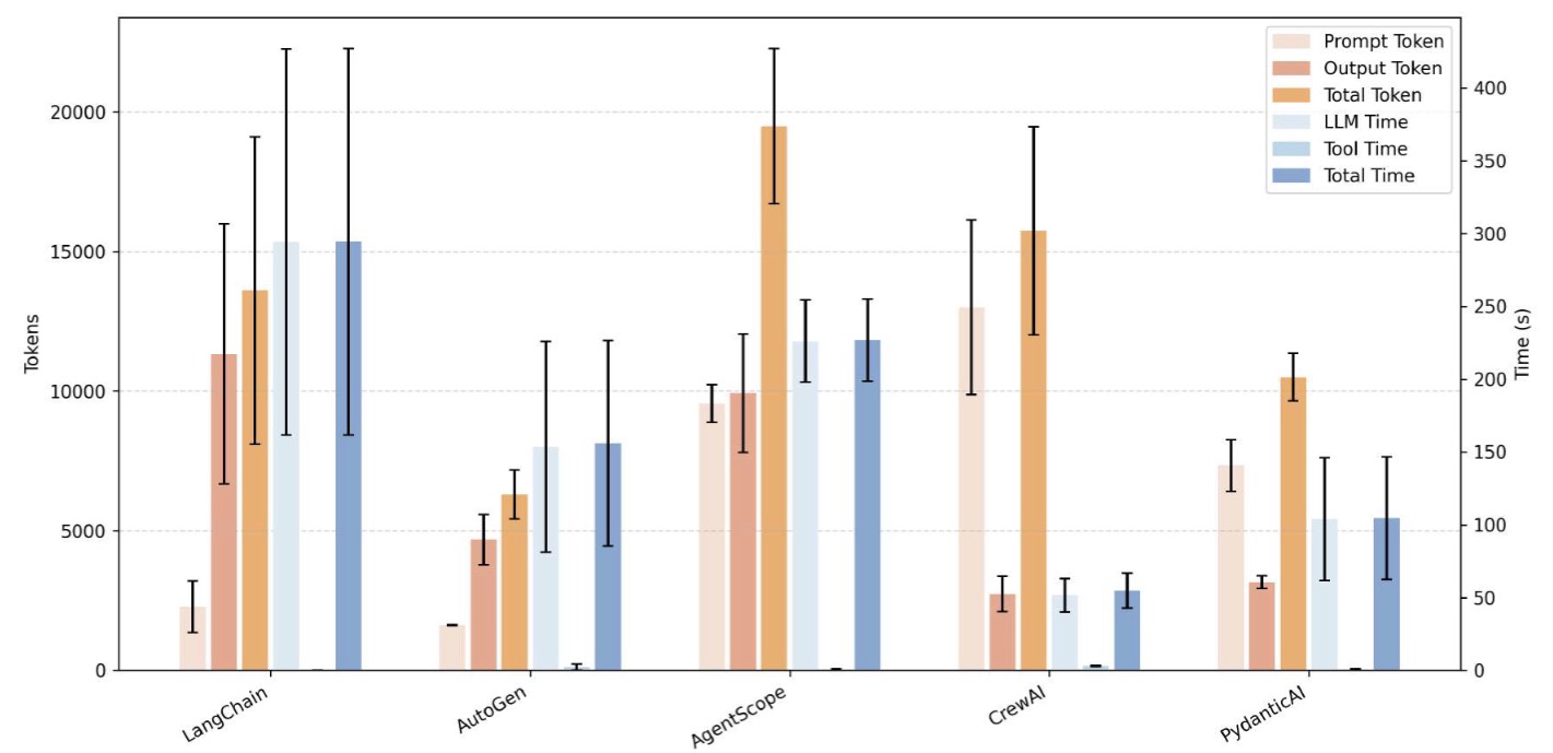 The pronounced disparity in execution times can be attributed to heterogeneous orchestration layers and I/O pathways across frameworks. Heavy operations, especially image-centric routines in figure-related tools, trigger large data transfers and repeated external API calls, amplifying serialization and network overhead. Frameworks with leaner orchestration logic (e.g., CrewAI) perform these steps with fewer intermediate abstractions, thereby reducing latency, whereas frameworks with deeper abstraction stacks (e.g., AgentScope) accumulate additional processing overhead. Consequently, tool latency scales not only with the intrinsic cost of the operation but also with the efficiency of each framework’s data handling, scheduling, and resource management pipelines.
